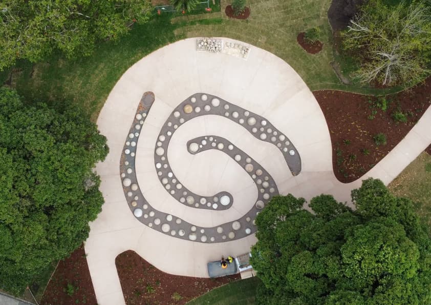 It comprises of 243 sandstone rocks arranged in a spiral, featuring carvings of local hands, flora and fauna with most of the sandstone being reclaimed from an Inner West depot yard.