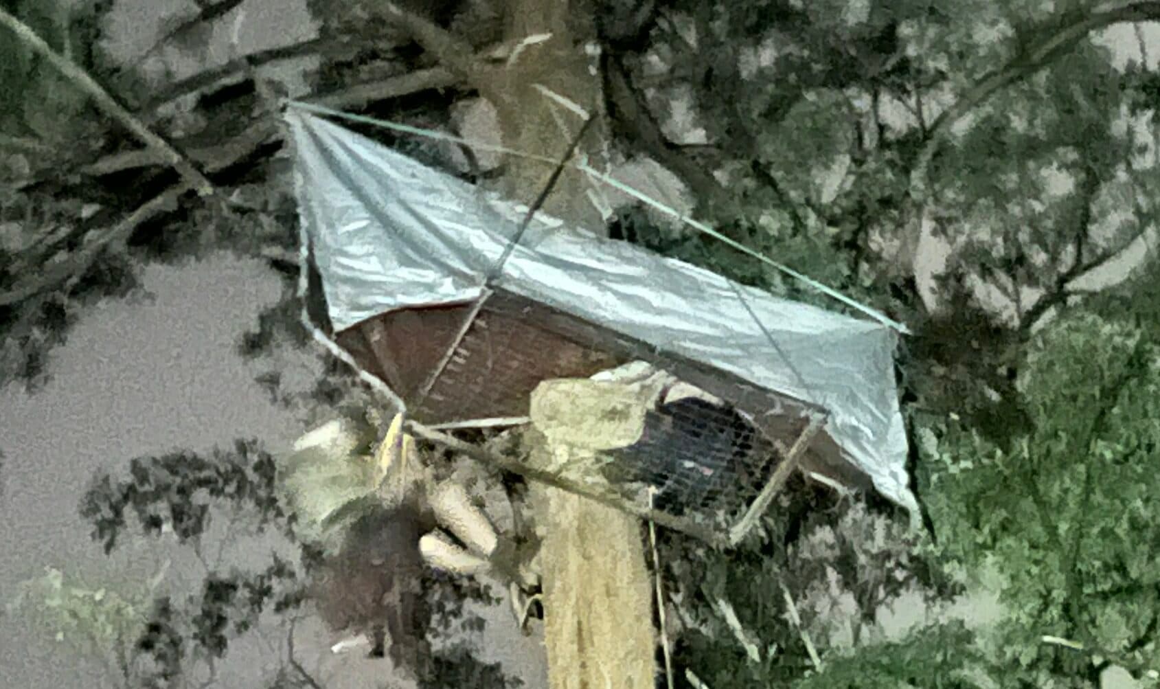 Lismore law student Kashmir Miller was today dangling from a tree 25 m up attached to 3 tree harvesting implements.