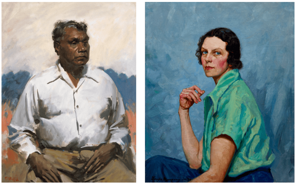 Image credits: Left to right, William Dargie Portrait of Albert Namatjira 1956, Queensland Art Gallery | Gallery of Modern Art, purchased 1957 © Estate of William Dargie. Photo: QAGOMA; Tempe Manning Self-portrait 1939, Private collection, © Estate of Tempe Manning