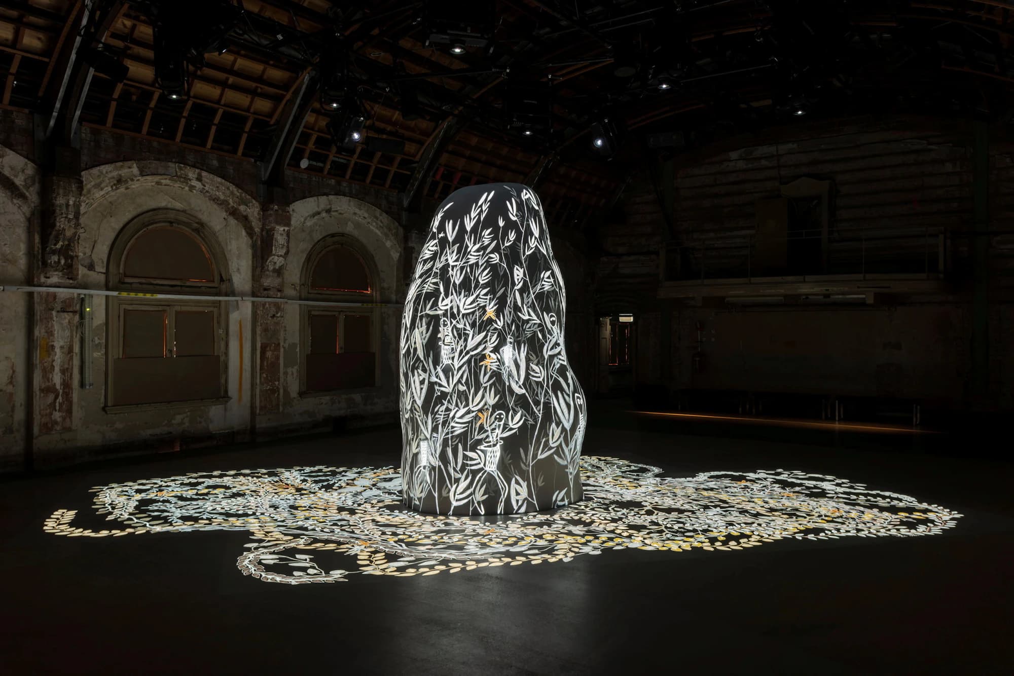 Image: Mulkuṉ Wirrpanda with The Mulka Project Rarrirarri 2023, commissioned and produced by RISING and co-commissioned by Illuminate Adelaide for Shadow Spirit (2023) curated by Kimberley Moulton (Yorta Yorta), courtesy and © the artists and The Mulka Project, Yirrkala