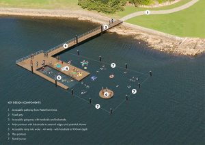 It will have it’s own pathway to the baths from Waterfront Drive, a fixed jetty with handrails and a 4-metre wide ramp you can walk out into the water providing a shallow area for younger kids. It will also have a main pontoon and play pontoon further out, as well as a shark barrier.