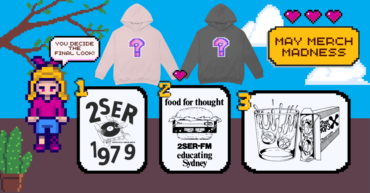 Get Ready for May Merch Madness! We’re thrilled to announce that 2SER is launching our very first hoodie, just in time for winter! This Saturday, the 26th, head over to our Instagram @2ser107.3 and check out our story to cast your vote for the design you want to see featured on a 2SER hoodie! The poll will be open for just 24 hours, so don’t miss out on this chance to make your choice count! Keep your eyes peeled on our social media and newsletter throughout May for the opportunity to purchase your very own 2SER hoodie, all while supporting community radio.